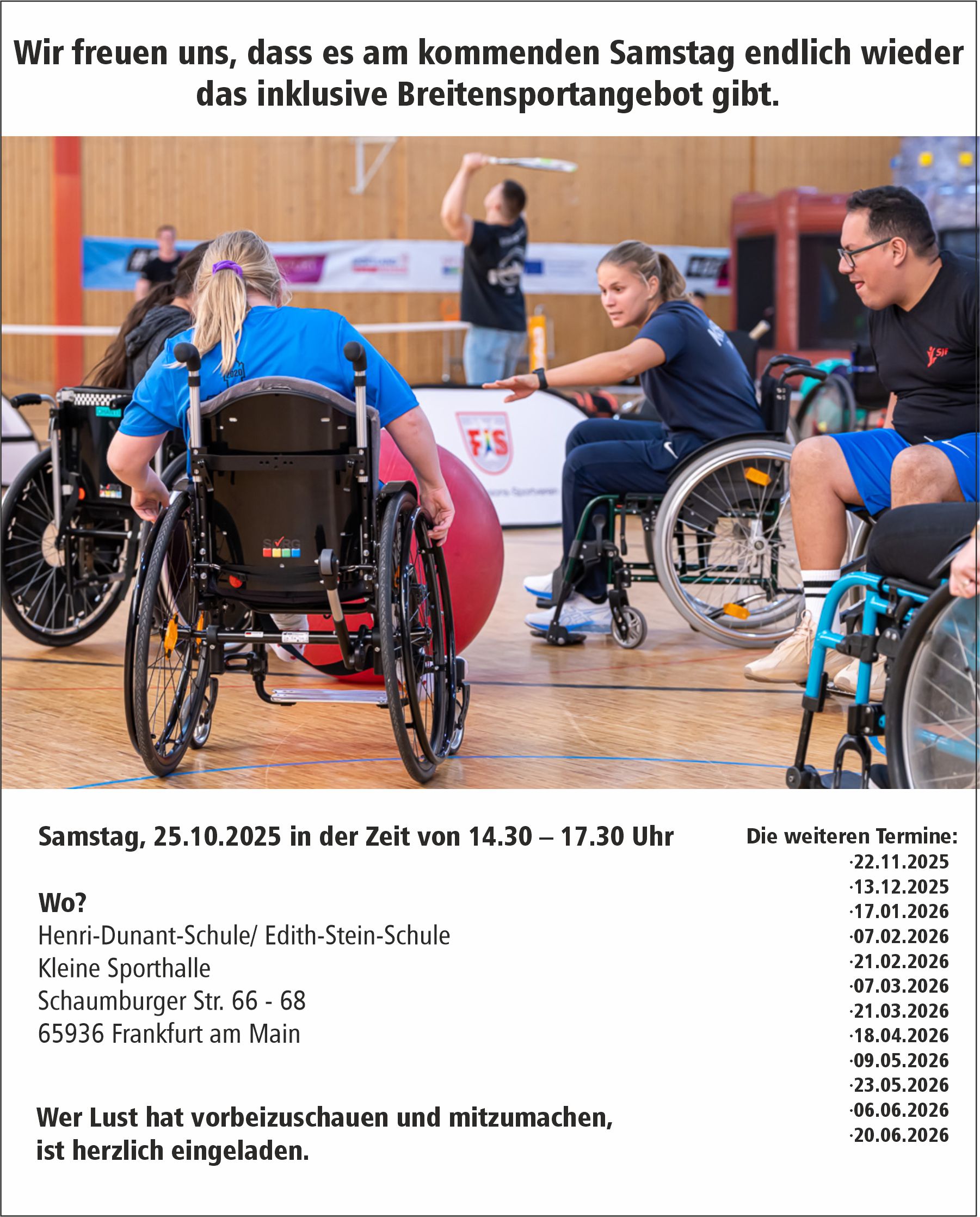 Kurzfristig kam die Sportjugend Frankfurt auf uns zu, ob wir nicht im Rahmen ihrer Ferienaktion einen besonderen Tag gemeinsam gestalten wollen und so gibt es morgen Basketball (auch im Rollstuhl), Wheelsoccer, das inklusive Sportabzeichen, Rollstuhlparcours, Sinnesparcours, Hüpfburgen, Gesellschaftsspiele, Badminton und vieles mehr.
